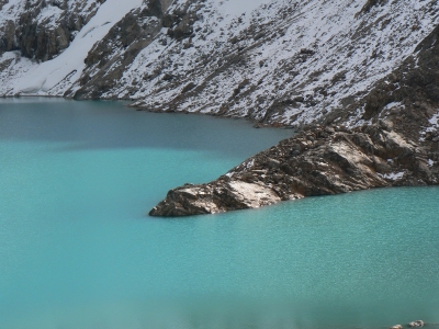 a rocky lake at the foot of the peaks awaiting the